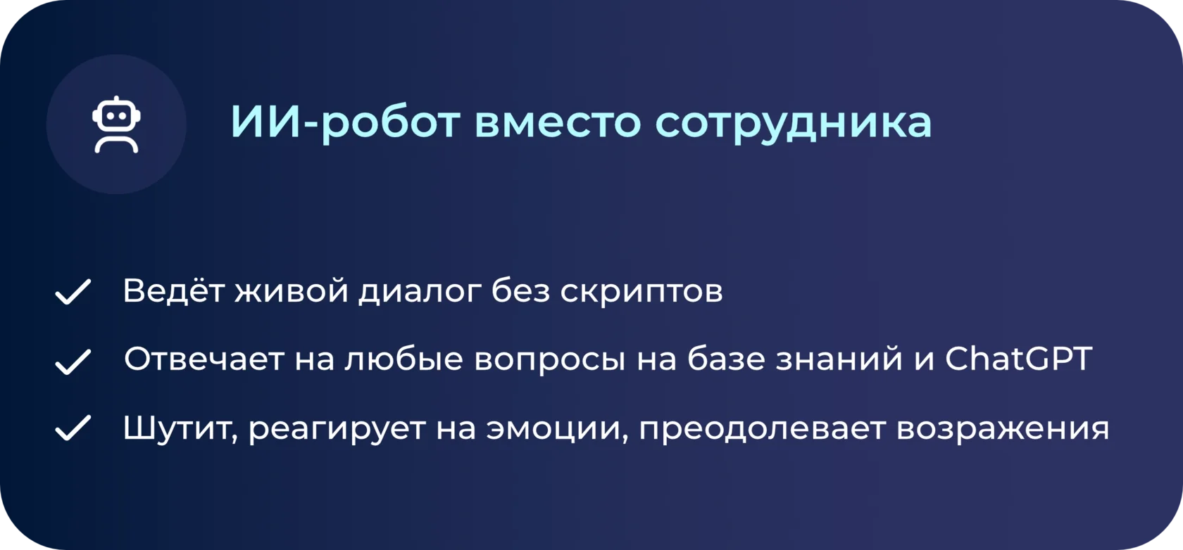 Наши роботы не работают по жёстким сценариям, они понимают речь и ведут диалог «по человечески». Их можно перебивать.