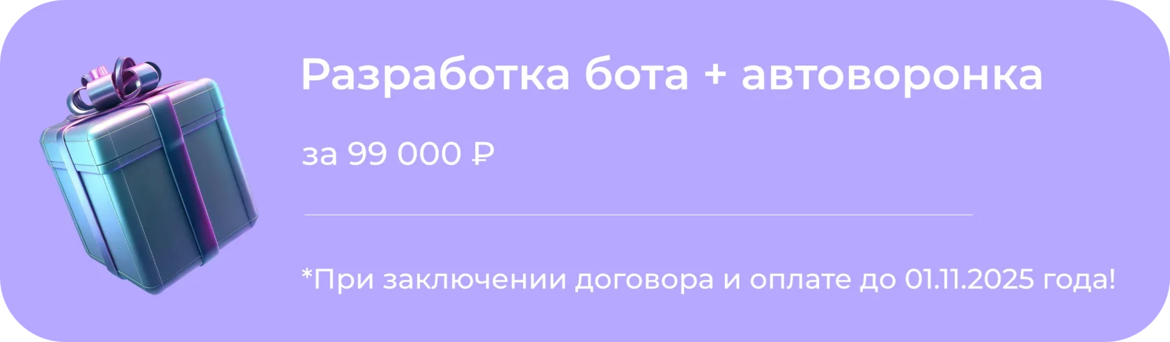 Вы платите 1 раз за разработку. Ваш робот — навсегда ваш. Личный кабинет, доступ 24/7, запуск одним кликом.